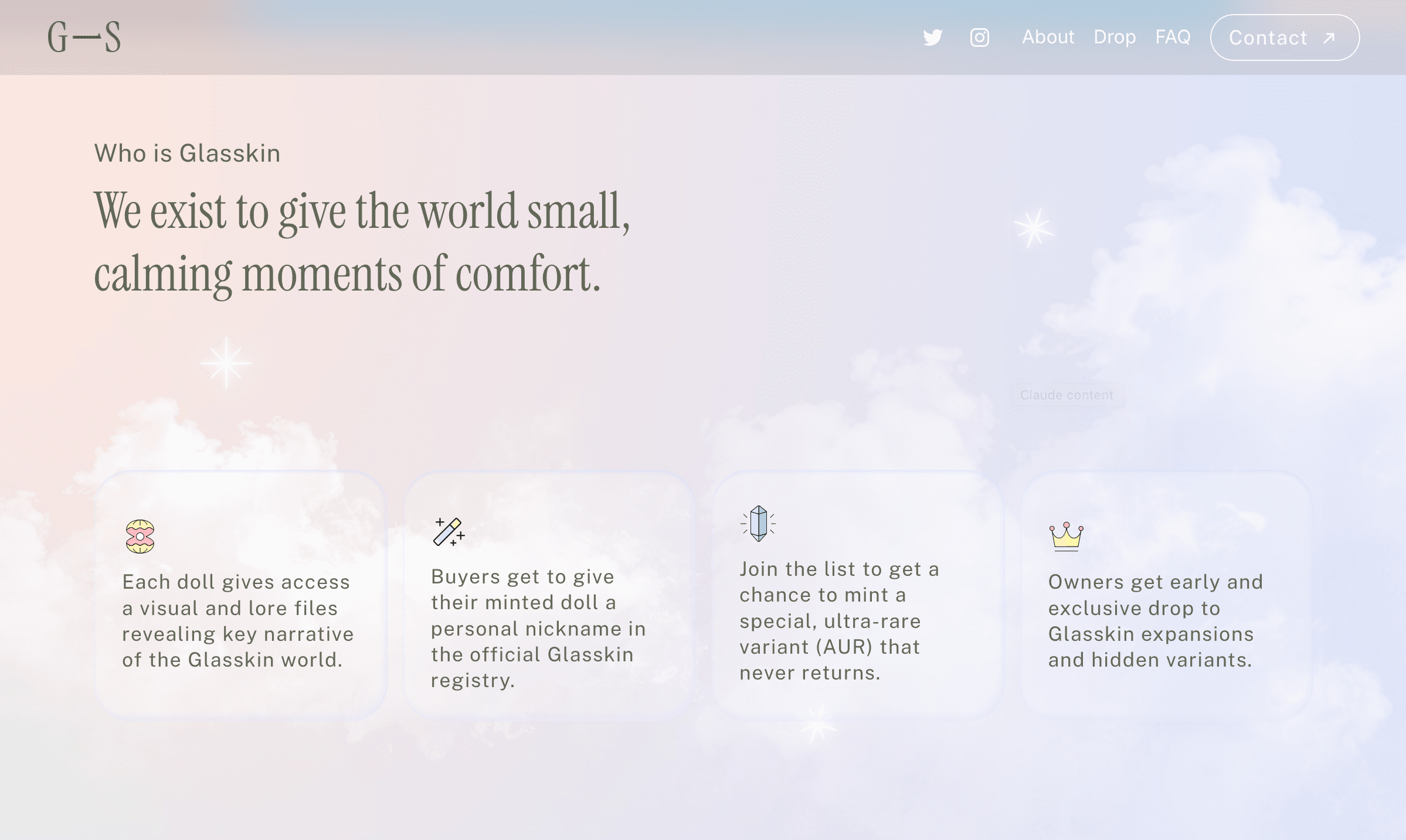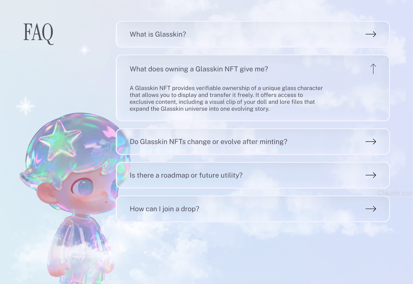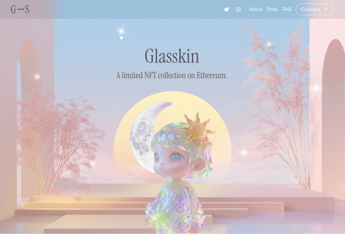 Glasskin is a conceptual art-directed NFT character collection through structured AI prompting, then designed a cohesive visual system and landing page — positioning digital collectibles as emotional objects, not speculative assets.