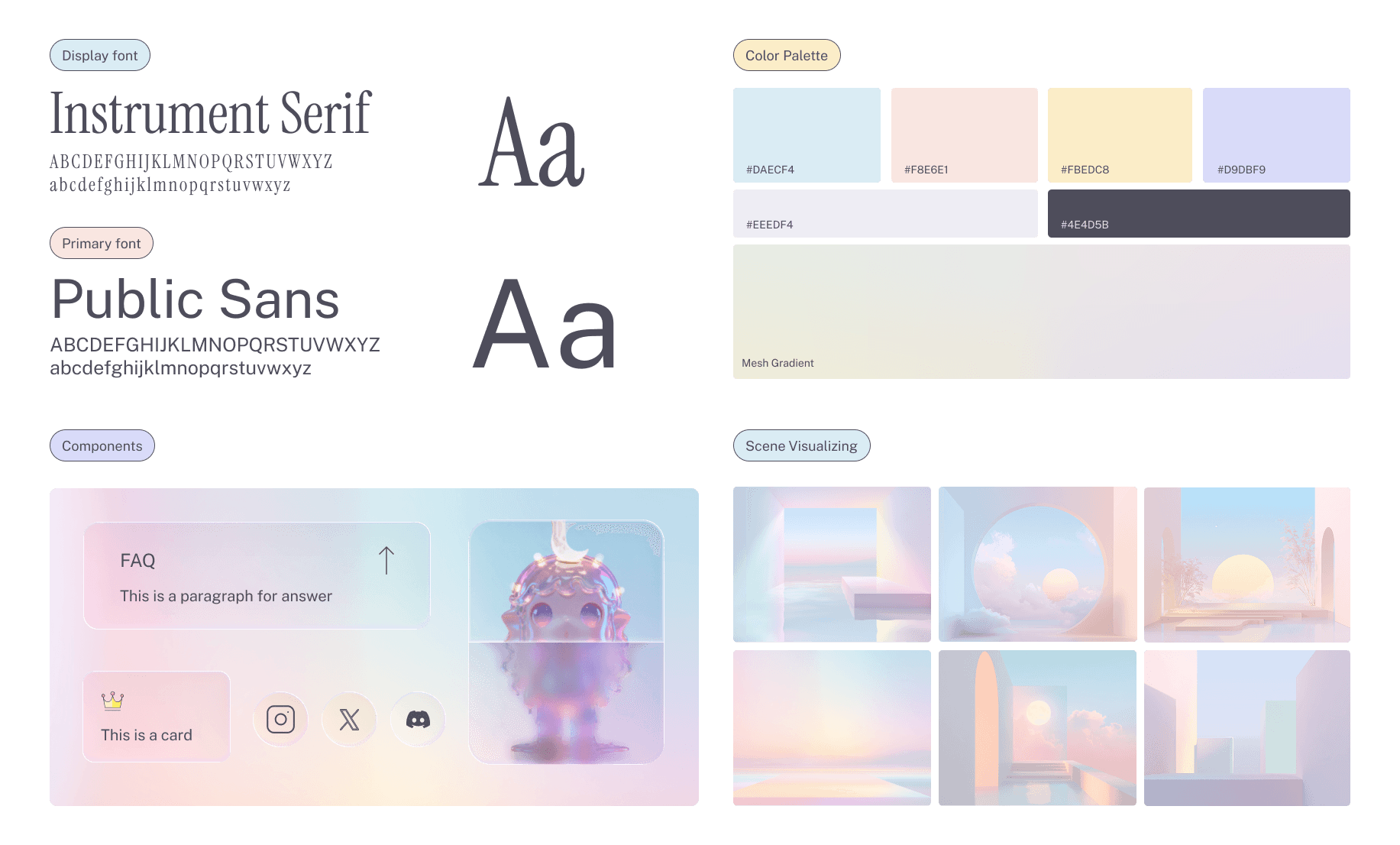 Paired Instrument Serif with Public Sans to balance poetic warmth and interface clarity. Built a pastel gradient palette that echoes morning mist without losing contrast.
